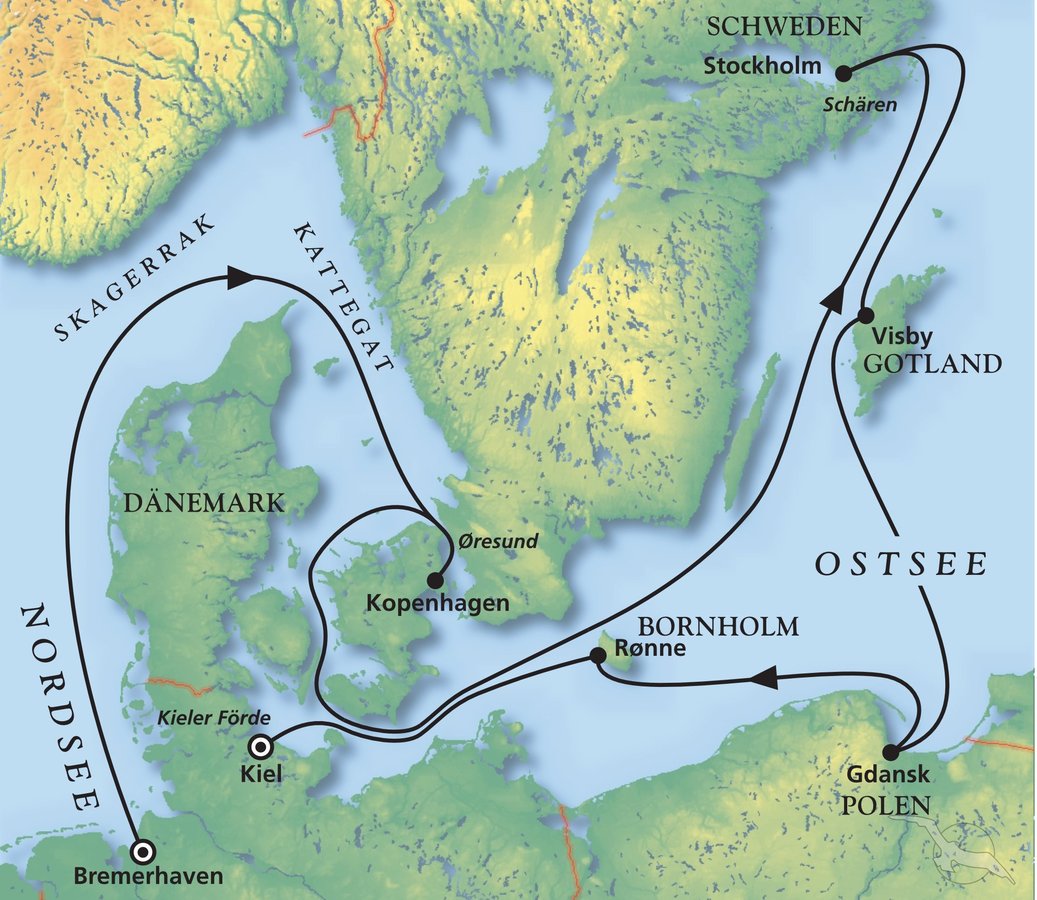 Bremerhaven - Kopenhagen - Stockholm - Visby (Gotland) - Gdansk (Danzig) - Rønne (Bornholm) - Kiel